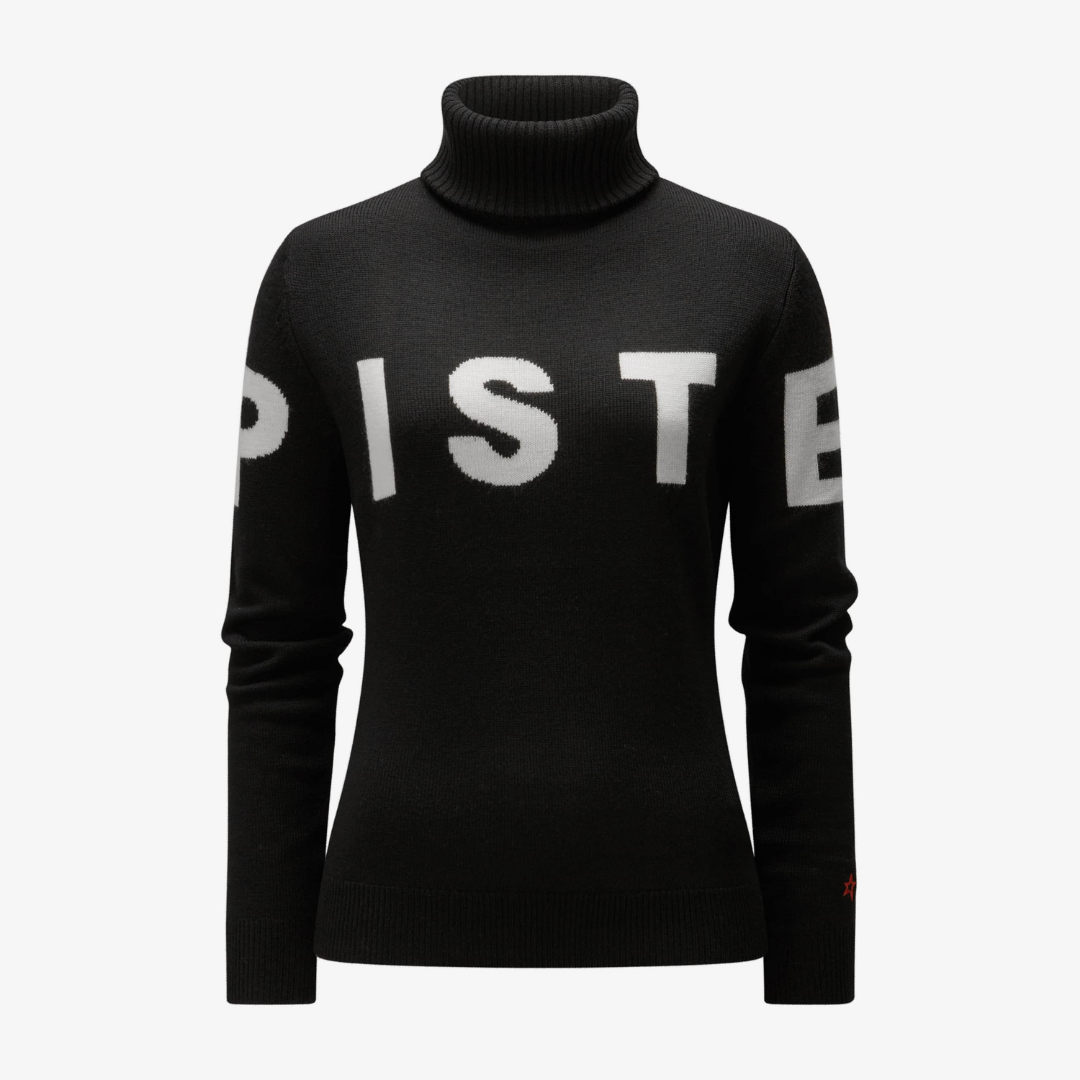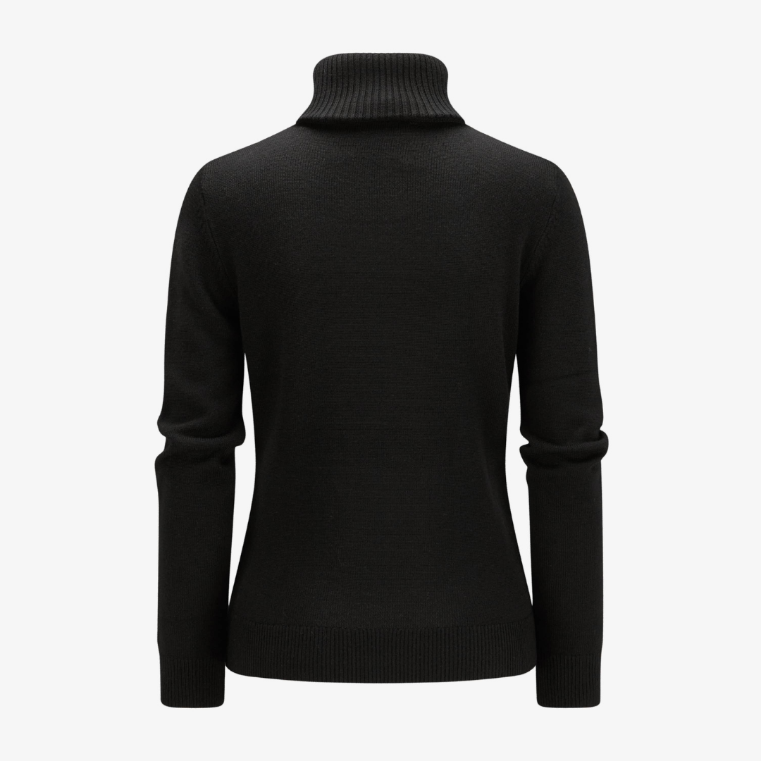 Shield turtleneck sweater for women. Designed for refined winter and après-ski looks, this sweater is crafted from extra-fine merino wool for an exceptionally soft and comfortable feel. The timeless silhouette is elevated by subtle contrasting details and a lettering inlay, making it a stylish companion both on and off the slopes.